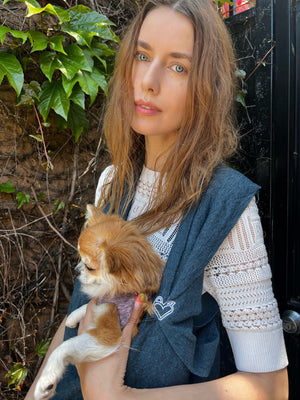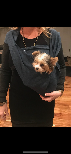 This is the same as the original Shark Tank version but newly improved with edge binding now available for heavier dogs. This sling has slightly wider straps for more support and a deeper pouch in the back good for smaller to medium dogs alike.